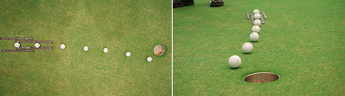 Đặt nó thẳng hàng với cốc lỗ (ở nhà dùng cốc lỗ cao su hoặc đồng xu) rồi đẩy bóng. Khi thực hiện cú đánh, bạn có thể quan sát kỹ hướng bóng đang di chuyển về phía mục tiêu và kiểm tra cú putt của mình xem nó đi thẳng hay cong sang phải hay trái.