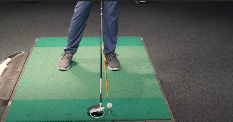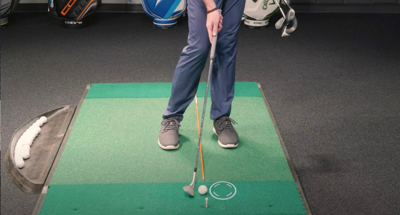 Với bóng gôn và dụng cụ định hướng được thiết lập như hình dưới đây, hãy bắt đầu với hai bàn chân rộng bằng vai và đảm bảo rằng gót chân trái nằm trên một đường thẳng với dụng cụ hỗ trợ căn chỉnh trên mặt đất.