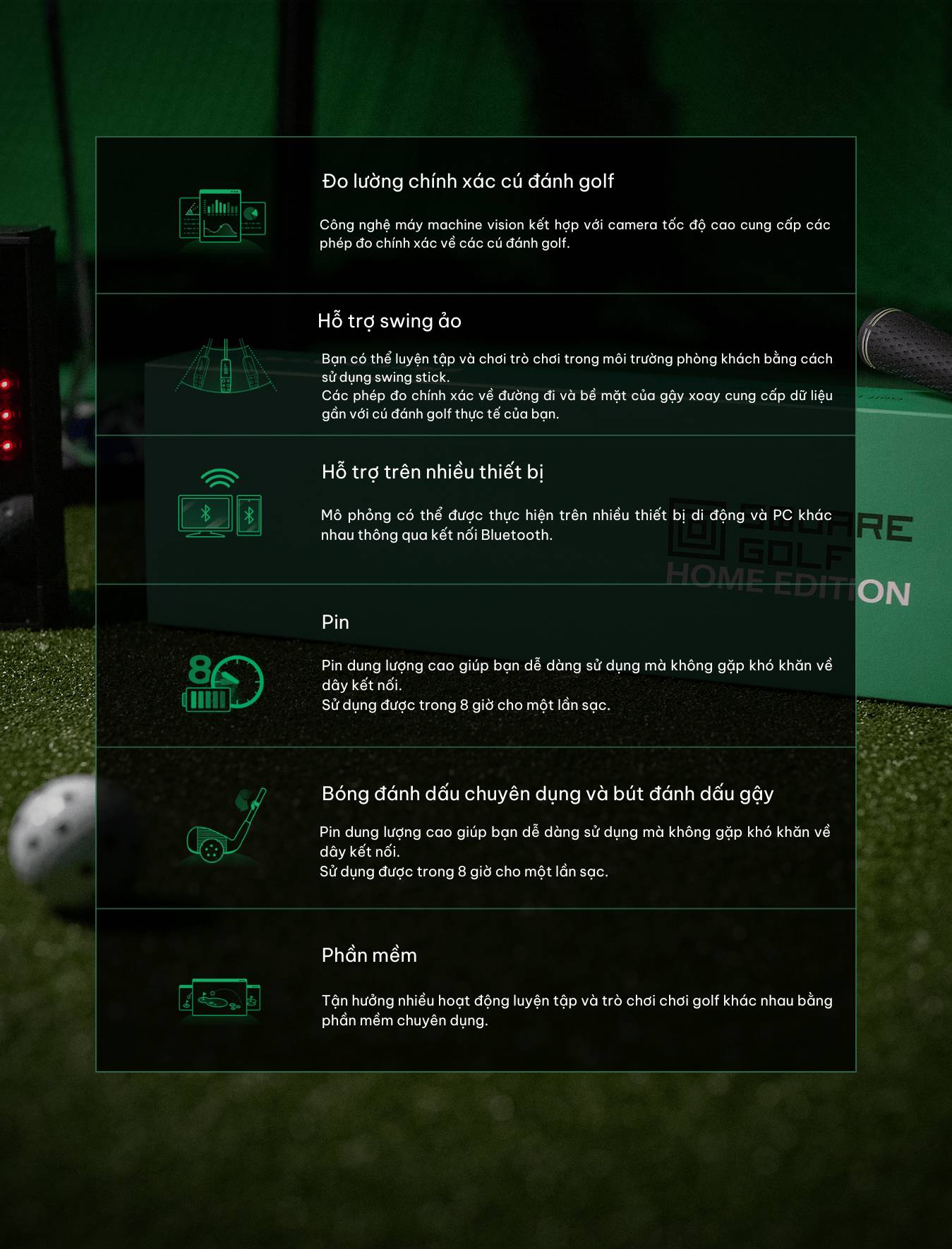 Biểu diễn đồ họa trực quan của tất cả các loại cú đánh golf bao gồm gậy driver, gậy sắt, gậy wedge, gậy putting cung cấp phản hồi hiệu quả cho các cú đánh golf của bạn.