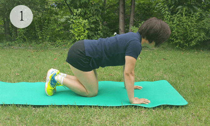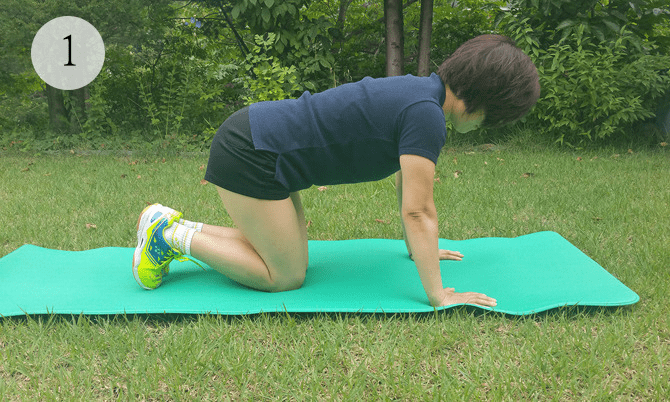 ① Ở động tác trước, dang rộng cả hai chân và hai chân.