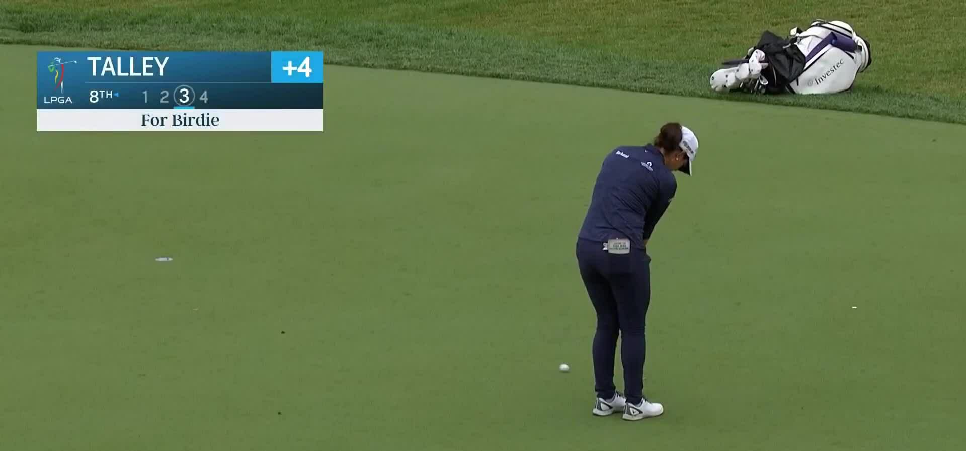 Tay golf người Mỹ bắt đầu ở lỗ thứ 10, với tỷ lệ +4 sau cú putt ghi được một cú bogey ở lỗ thứ 6. Theo thói quen, mỗi khi bỏ lỡ cơ hội để giữ hoặc ghi thêm điểm, Talley lại đánh đầu đưa bóng vào gầm giày trái. Cú đánh nhẹ nhưng làm hỏng dụng cụ lao động. Theo luật, nó chưa bị “vô hiệu hóa”, nhưng Talley nói rằng cô không thể tiếp tục sử dụng nó vì tay cầm bị cong.
