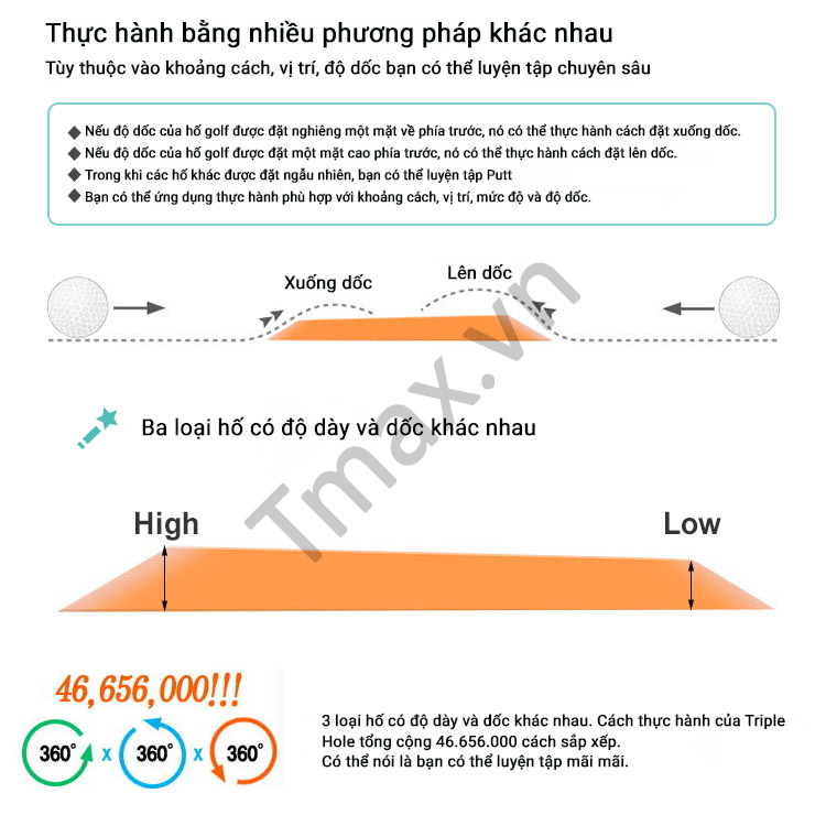 Không chỉ đơn thuần là những cú đánh Putt phẳng. Triple Hole là sản phẩm thông mình mô tả những cú đánh Putt lên dốc và xuống dốc. Kết hợp Triple Hole với các mức độ khó khác nhau để rèn luyện kỹ năng, việc luyện tập sẽ trở nên thú vị hơn mỗi ngày.