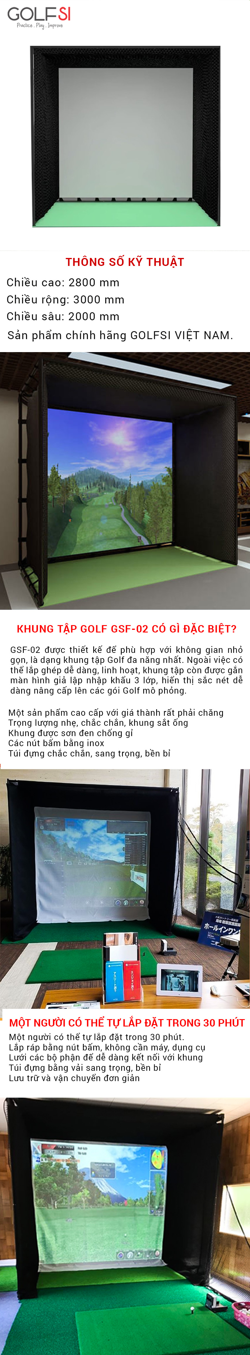 GSF-02 được thiết kế để phù hợp với không gian nhỏ gọn, là dạng khung tập Golf đa năng nhất. Ngoài việc có thể lắp ghép dễ dàng, linh hoạt, khung tập còn được gắn màn hình giả lập nhập khẩu 3 lớp, hiển thị sắc nét dễ dàng nâng cấp lên các gói Golf mô phỏng.