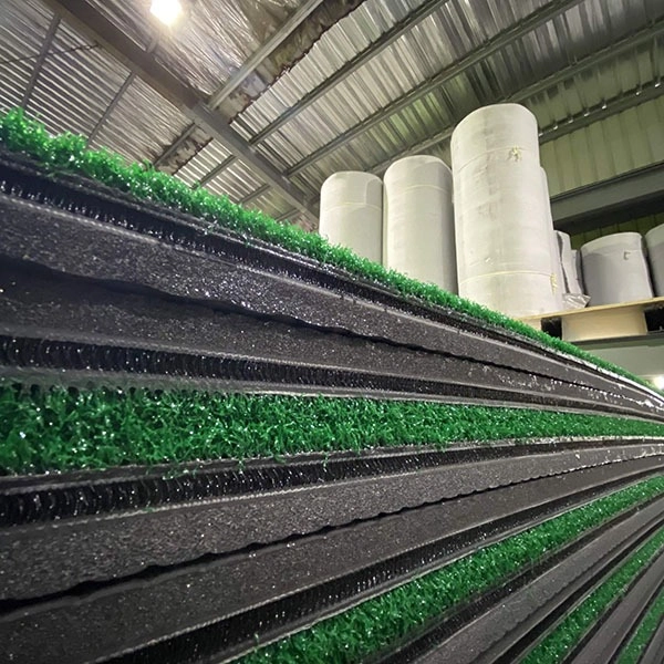 Trong toàn bộ quá trình sản xuất, chúng tôi chần các sợi cỏ lên vải lót và liên kết cỏ với đệm xốp bằng keo.