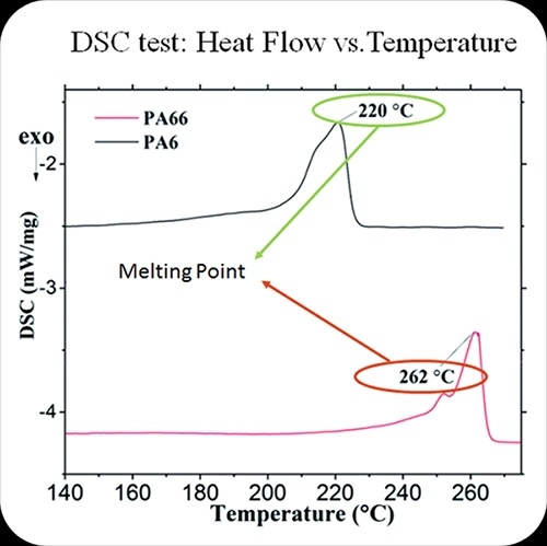 Đặc tính quan trọng nhất là điểm nóng chảy cao hơn của PA6.6. So với điểm nóng chảy của PA6, khoảng 220°C, khả năng chịu nhiệt của PA6,6 có thể đạt tới trên 260°C. Trên thực tế, đặc tính này tạo ra sự khác biệt lớn bởi vì mỗi khi đầu gậy sắt của bạn chạm vào thảm tập đánh gôn, nhiệt độ tỏa nhiệt tức thời có thể lên tới cực cao. Do đó, khả năng chịu nhiệt của PA6.6 này thực sự làm cho thảm tập GolfSi bền hơn sau thời gian dài sử dụng. Biểu đồ bên dưới cho thấy PA6 bắt đầu tan chảy ở 220°C, trong đó P6.6 không có bất kỳ thay đổi vật lý nào cho đến 262°C.