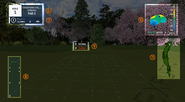 Thông tin về độ cao hiện tại của green cũng như vị trí của hố và bóng sẽ được hiển thị.